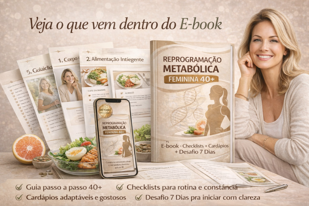 Este e-book foi organizado para mulheres 40+ que querem um caminho prático, claro e possível. Sem promessa milagrosa — com foco em estratégia, aderência e rotina.